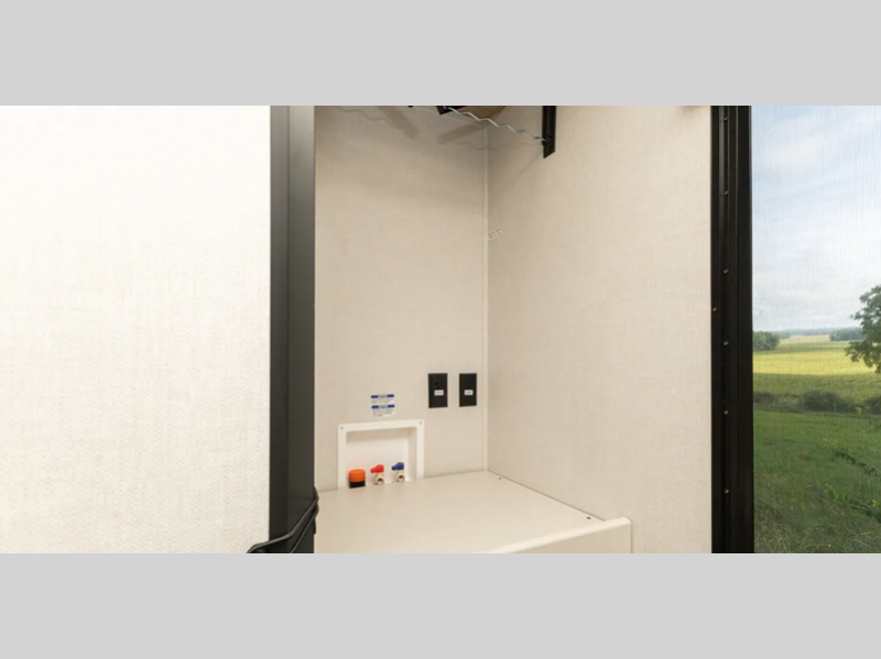 - Universal Docking Station Enclosed in Cargo Storage - Hookups Included: Cable & Satellite Switch, Fresh-Tank Gravity Fill, City Water, Black Tank Flush, Winterization Pump, Outdoor Shower, GFI Outlet, And Space Prepped for Solar Panel Controller