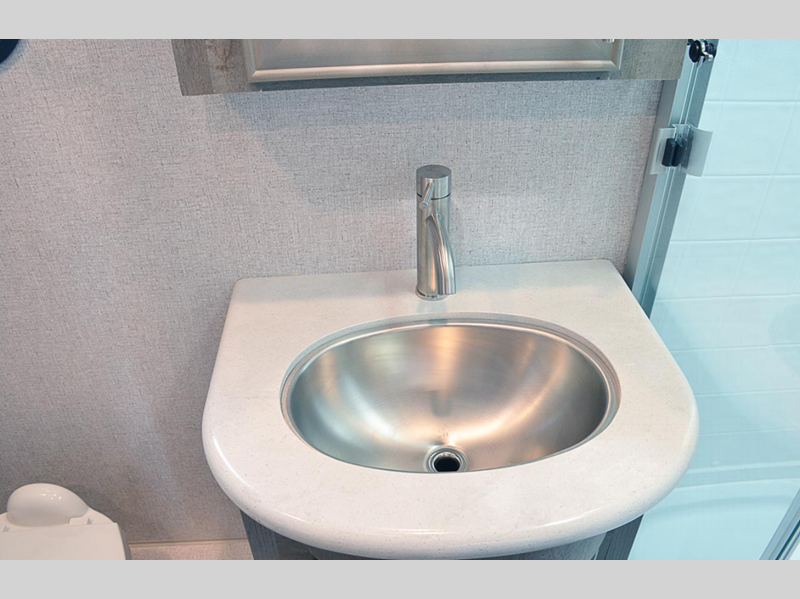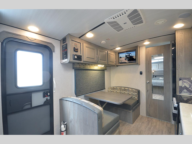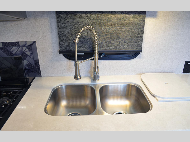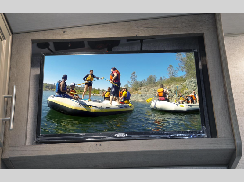 On the interior, you will find a kitchen skylight with a shade to keep the space bright and cheerful, and the USB charging ports on both sides of the bed will certainly be a major convenience. The exterior has quite a few fun features too, like the outside speakers, exterior shower, and a 12V LED awning with adjustable pitch.