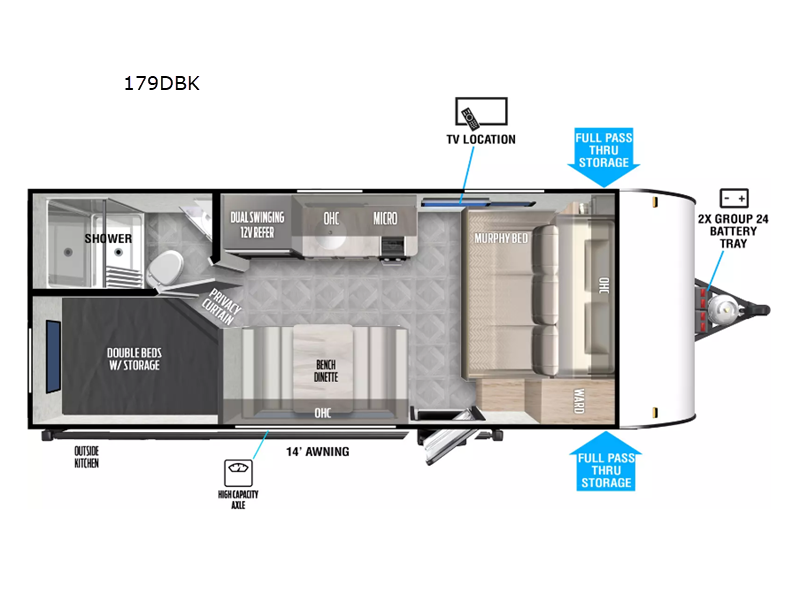 Find all you're looking for and more in this versatile travel trailer. The queen Murphy bed will be perfect for a great night's rest, and in the morning you can easily fold it up to relax on the sofa. The chef of your group can prepare breakfast on the two burner cooktop, or head outdoors on the outside kitchen. The full bath allows you to stay clean all week, and the double-size bunks will be perfect for extra guests. This model also includes a full pass-through storage, so bring the fishing poles along!
